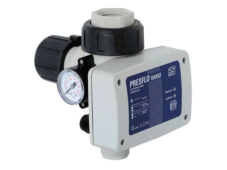 Die elektronische Pumpensteuerung PRESFLO VARIO schaltet die Pumpe selbsttätig beim Absinken des Anlagendrucks durch Öffnen der Wasserentnahmestelle ein. Nach Erreichen des Abschaltdruckes oder nach dem Schließen des Wasserhahns wird die Pumpe wieder abgeschaltet. Inklusive Trockenlaufschutz (automatische Abschaltung bei Wassermangel) und Schutz vor abnormen Betriebsbedingungen (z. B. tropfender Wasserhahn).